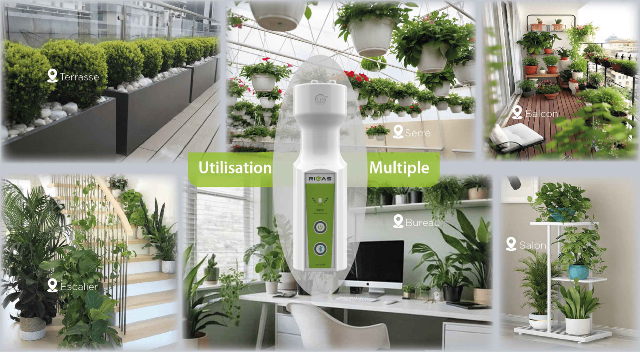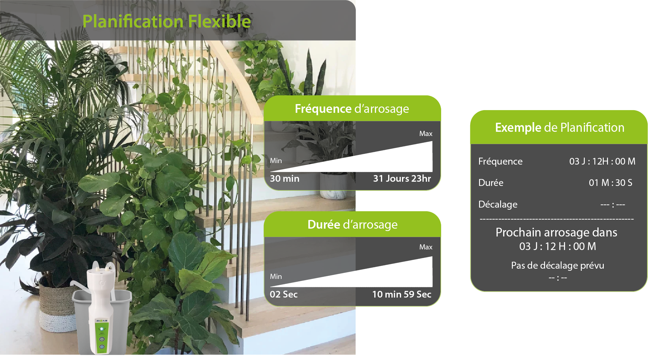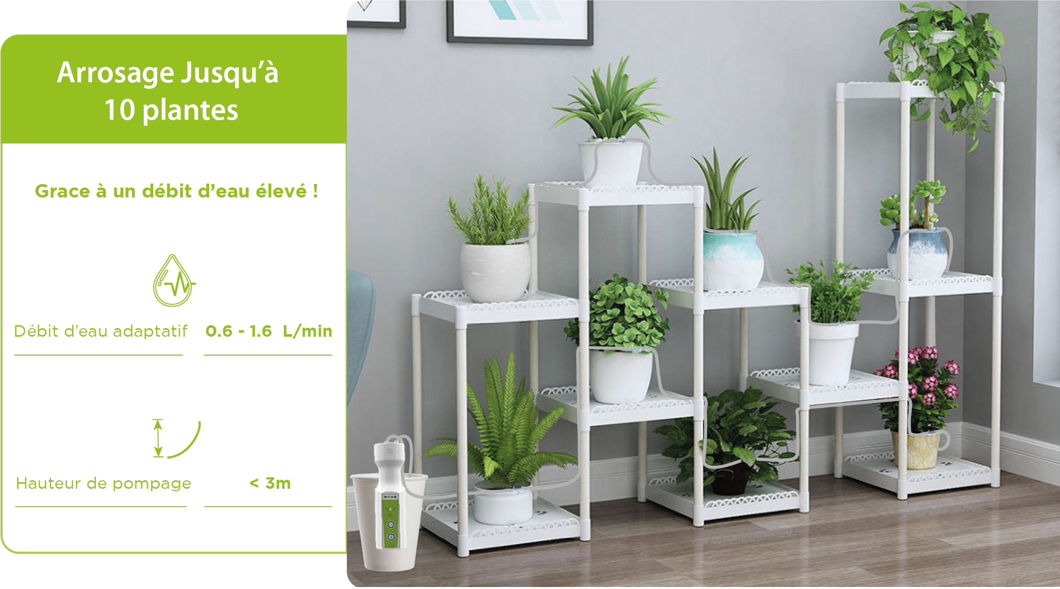Fonctionne avec un simple récipient d’eau, sans robinet ni prise électrique, et offre jusqu’à 45 jours d’autonomie grâce à sa batterie lithium-ion rechargeable via USB (câble fourni). Programmable via application mobile gratuite (Bluetooth), avec une fréquence réglable de 30 minutes à 31 jours 23 h. Fonction de décalage ponctuel permettant un ajustement de 1 h à 10 jours 23 h selon la météo (pluie, chaleur…) sans modifier la programmation initiale. Activation manuelle possible de l’arrosage. Arrose jusqu’à 10 pots simultanément, extensible à 20 pots avec arroseurs et raccords supplémentaires disponibles séparément. Doté d’un débit adaptatif s’ajuste automatiquement en fonction de l’installation adoptée (~0,6 L/min à ~1,6 L/min), avec possibilité d’arrosage goutte-à-goutte ou jet réglable selon vos besoins. Le kit complet inclut tuyaux, arroseurs, raccords, filtre, support réglable et câble de recharge, permettant une installation flexible et adaptée à tous types de plantes et de pots. Installation simple et rapide, garantie 1 an.