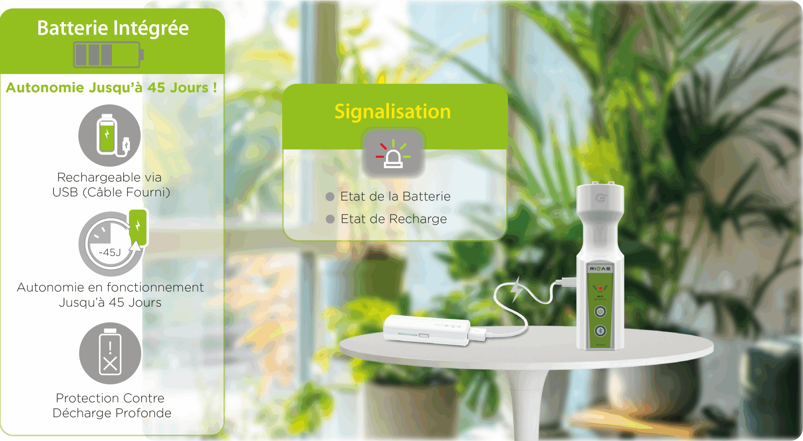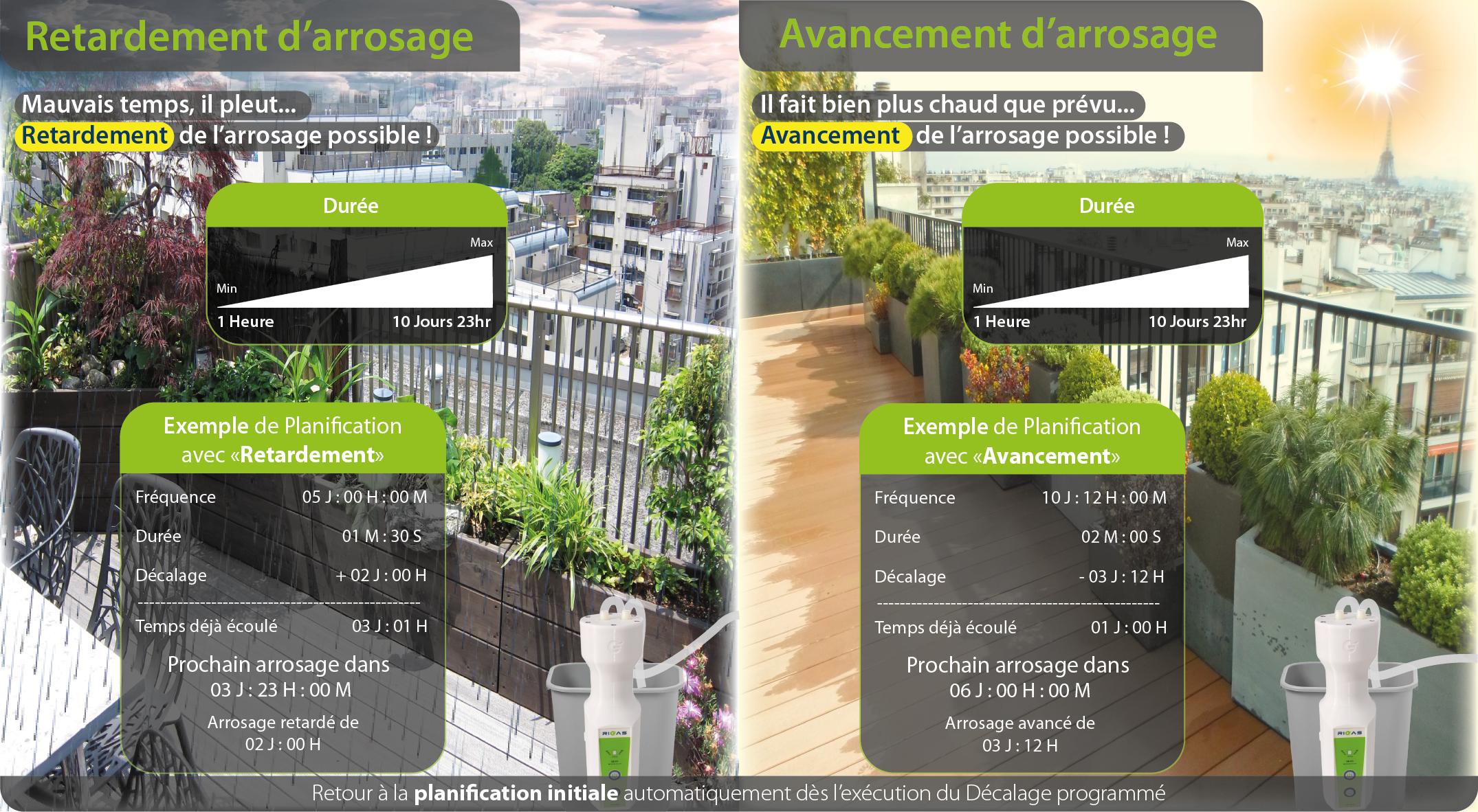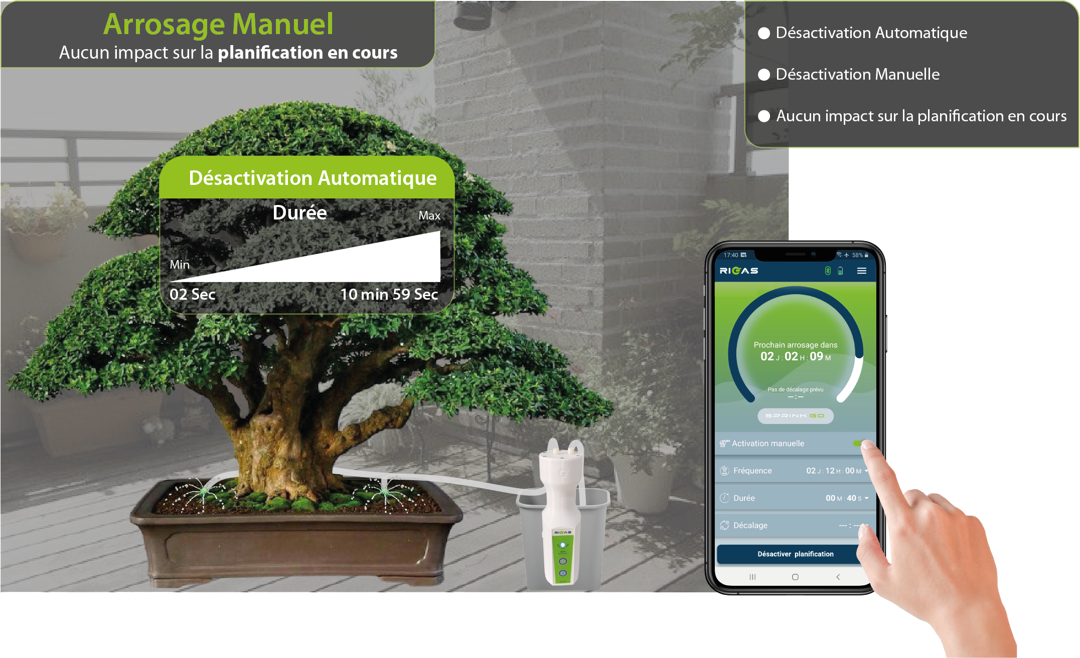 Fonctionne avec un simple récipient d’eau, sans robinet ni prise électrique, et offre jusqu’à 45 jours d’autonomie grâce à sa batterie lithium-ion rechargeable via USB (câble fourni). Programmable via application mobile gratuite (Bluetooth), avec une fréquence réglable de 30 minutes à 31 jours 23 h. Fonction de décalage ponctuel permettant un ajustement de 1 h à 10 jours 23 h selon la météo (pluie, chaleur…) sans modifier la programmation initiale. Activation manuelle possible de l’arrosage. Arrose jusqu’à 10 pots simultanément, extensible à 20 pots avec arroseurs et raccords supplémentaires disponibles séparément. Doté d’un débit adaptatif s’ajuste automatiquement en fonction de l’installation adoptée (~0,6 L/min à ~1,6 L/min), avec possibilité d’arrosage goutte-à-goutte ou jet réglable selon vos besoins. Le kit complet inclut tuyaux, arroseurs, raccords, filtre, support réglable et câble de recharge, permettant une installation flexible et adaptée à tous types de plantes et de pots. Installation simple et rapide, garantie 1 an.